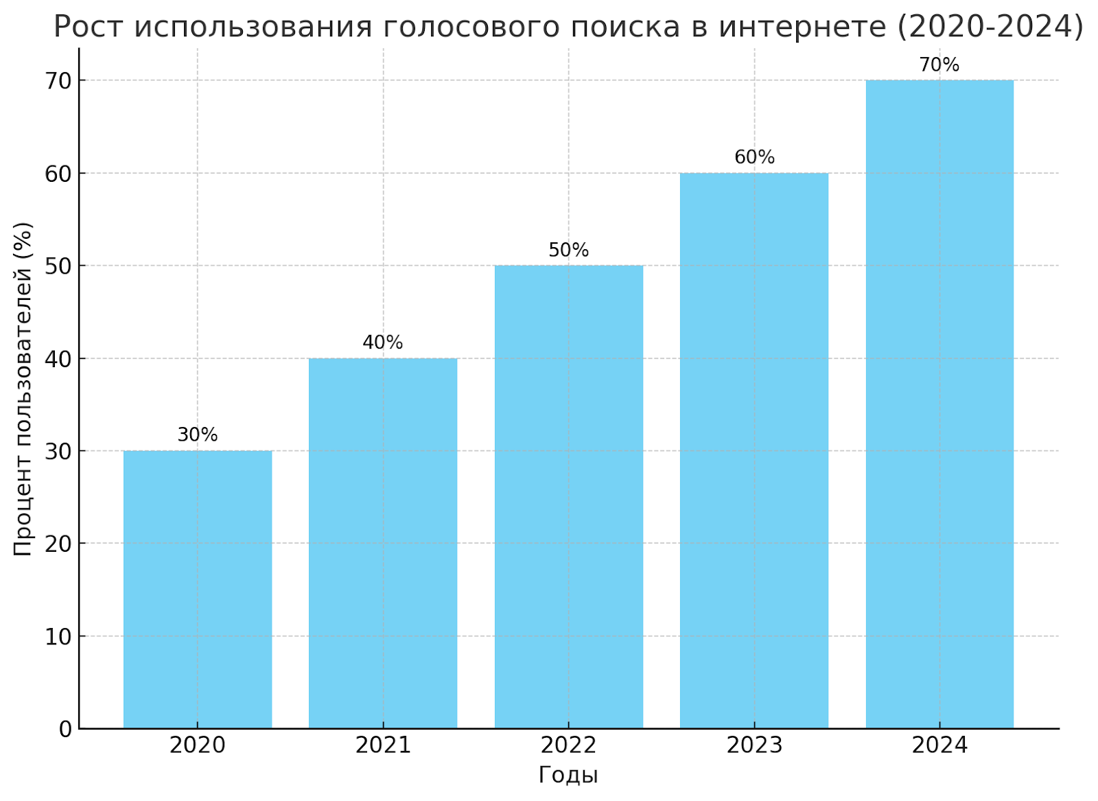 Вот диаграмма, которая иллюстрирует рост использования голосового поиска в интернете с 2020 по 2024 годы. Она показывает значительное увеличение процента пользователей, применяющих голосовой поиск, от 30% в 2020 году до 70% в 2043 году.